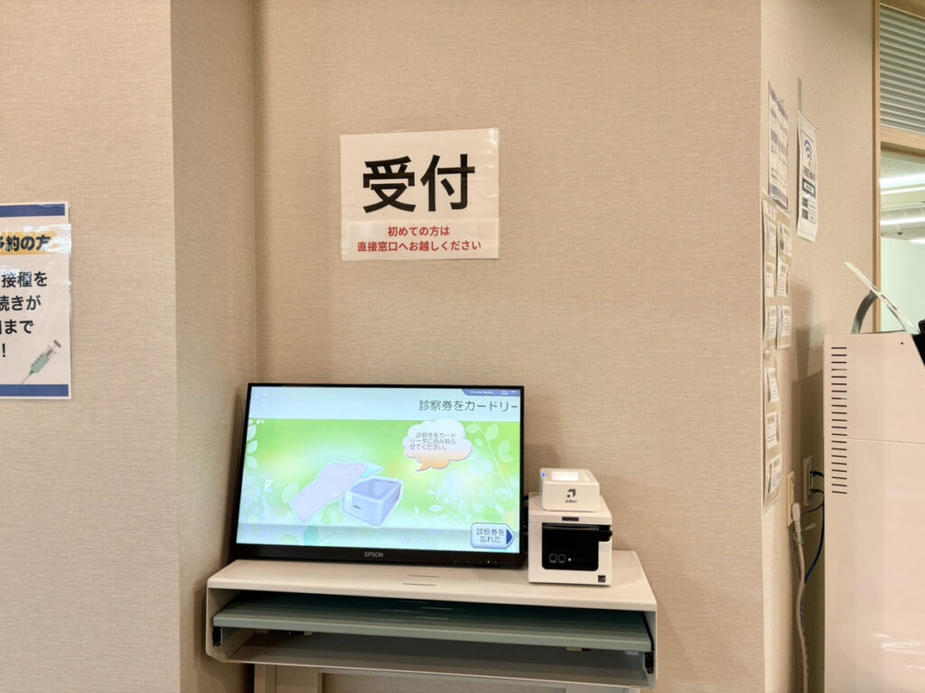 受付は、診察券を (写真の赤丸部分) にかざして読み込みます。