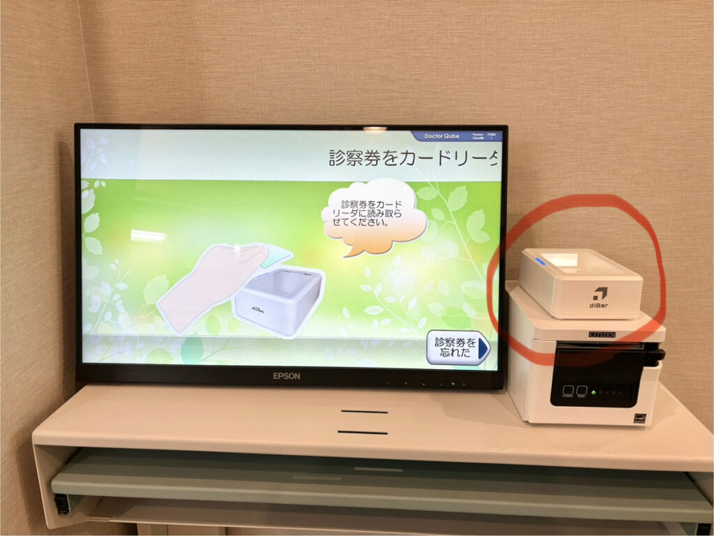受付は、診察券を (写真の赤丸部分) にかざして読み込みます。