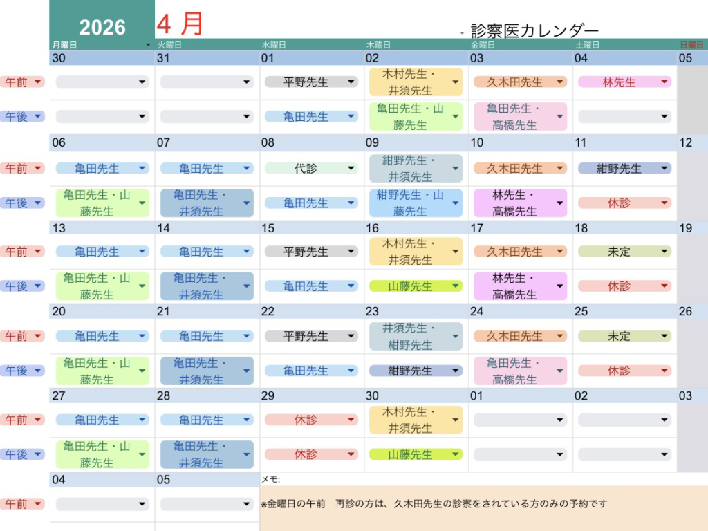 ※金曜午前の久木田先生の診察日ははくきた整形の受診歴ある方のみお受けしています。
