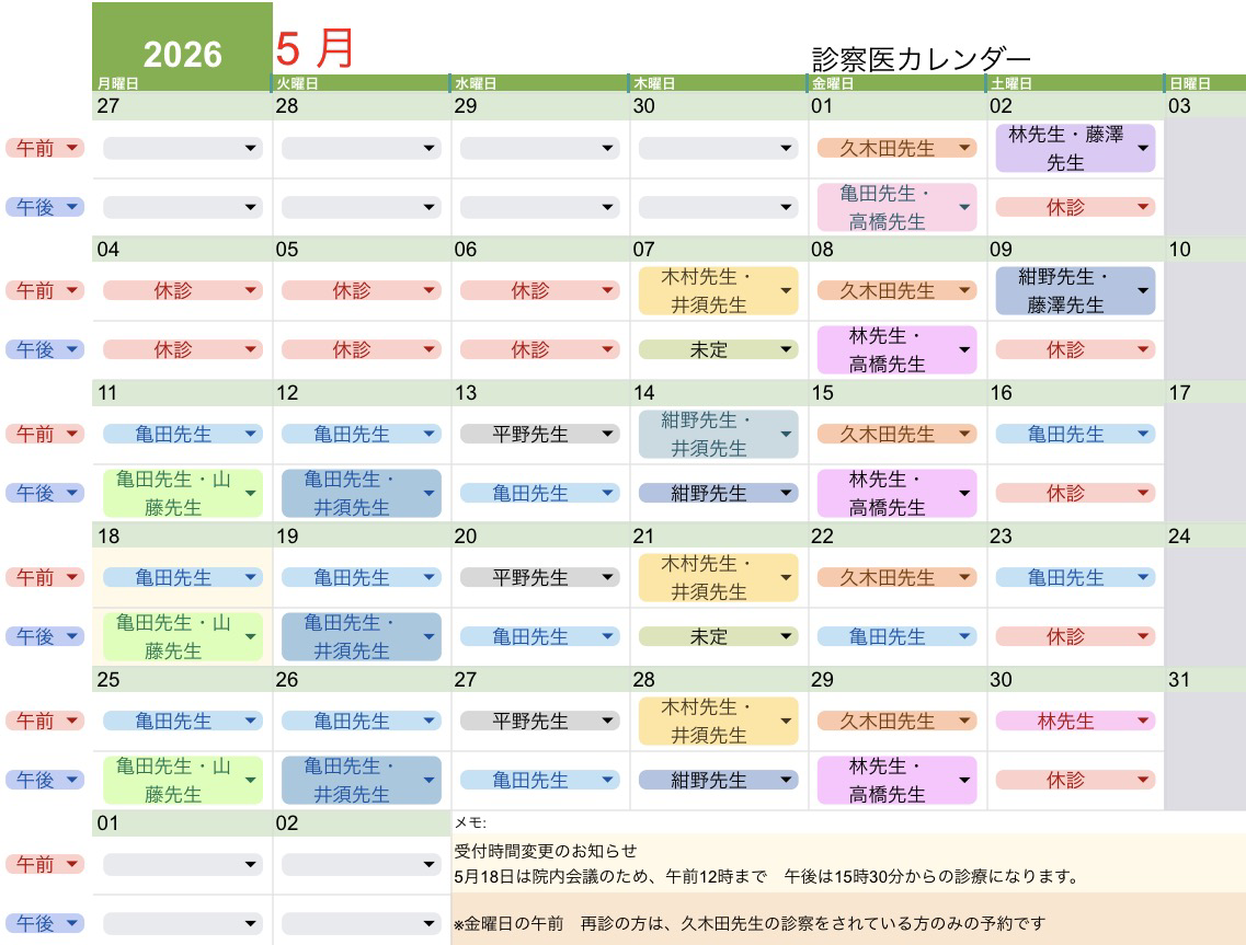 ※金曜午前の久木田先生の診察日ははくきた整形の受診歴ある方のみお受けしています。